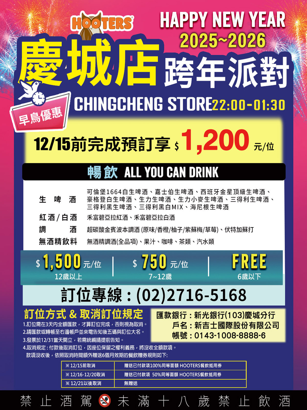 🦉Hooters慶城店 🥳2025~2026 跨年派對預訂!👯♀️